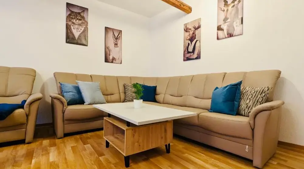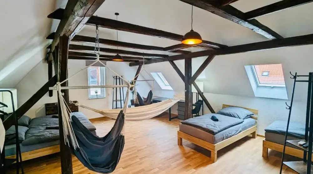 La propria metà di casa indipendente Die Arche si trova nel cuore del centro storico di Arnstadt, offrendo un alloggio spazioso e confortevole ideale soprattutto per famiglie con bambini o gruppi numerosi. Con una superficie generosa che può ospitare fino a sette persone o più grazie agli otto letti principali, due posti letto supplementari su sedie appese e la possibilità di aggiungere un lettino per neonati insieme ad altri accessori pensati per i piccoli, questo spazio è perfetto sia per soggiorni prolungati sia come base per esplorare le attrazioni della regione. L’arredamento curato e l’atmosfera accogliente sono sottolineate anche dalla vista dei travi in legno a vista, mentre gli ampi spazi interni permettono una permanenza rilassata senza rinunciare alla praticità: dal balcone privato alle zone comuni ben organizzate, ogni dettaglio è studiato per il comfort degli ospiti. La posizione strategica consente di raggiungere a piedi negozi alimentari, ristoranti storici come lo Schnitzelhaus zum Schwan, situato appena a cinquanta metri dall’alloggio, oppure il caratteristico Zum Brandopfer, altrettanto vicino, oltre al parco cittadino e ai servizi essenziali presenti nelle immediate vicinanze. A pochi chilometri sorge invece il castello medievale di Burg Gleichen (a soli 7 km), mentre distanze maggiori ma comunque raggiungibili agevolmente conducono verso località turistiche come Ilmenau (18 km) o Eisenach (circa 36 km dall’aeroporto locale). Per chi ama la natura o desidera attività all’aperto, il paese offre inoltre impianti sciistici come lo Skilift Am Ritter (20 km) e percorsi escursionistici nei pressi dello Stadtpark. Grazie alla connessione Wi-Fi gratuita disponibile durante tutto il soggiorno e allo spazio parking riservato davanti alla struttura, questa soluzione rappresenta un punto fermo per chi cerca autonomia e flessibilità nella visita ad Arnstadt.